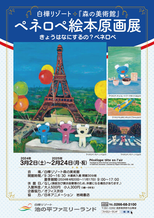 2024年3月2日(土)から2025年2月24日(月・祝)の期間、長野県茅野市にある白樺リゾート内の「森の美術館」にて『ペネロペ絵本原画展』が開催されます。